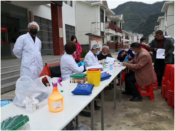 刚下车就看到,股泉村村委会广场四五十余名老人,都戴着口罩有序间隔一米,8名医护人员正在量血压、抽血、测血糖…,这是县公共检验检测中心驻村工作队和股泉村两委,邀请的野人谷镇卫生院医护人员,对村内65岁以上老人进行体检和健康签约上门服务。