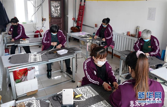 在黑龙江省平洋镇平洋村编织基地,工人们在编织(4月8日摄)。新华社记者 王建威 摄