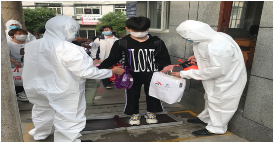 为今天九年级顺利复学,学校提前做了大量筹备工作。制定了详实、操作性强的“三案九制”,进行了复学推演,校园进行了全方位的清洁和消杀,迎接了各级领导的复学条件考核检查。今天最累的是学校成立的16人组成的志愿者服务队,由于学生全部住宿,所带行李多,家长不能进校园,学生的行李就靠志愿者老师帮忙搬运。志愿者中有即将退休的老教师,也有文弱的女教师,个个争先恐后一趟趟的为学生提、扛、推、抬着行李,令人感动。为防止学生携带管制刀具进校园,青峰派出所排干警专门对学生包裹进行探测仪扫描。青峰卫生院派专职医生,携基本的医药、器材,进驻校园。