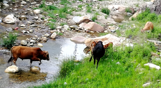 5头耕牛可不是个小事。接到电话后,所长朱杰立即带领两名民警赶到现场了解情况。“就是那5头牛,我们这儿附近没得人养牛。”在原地照看耕牛的曾大宏见到民警后,指着正在河沟里吃草的黄牛说。