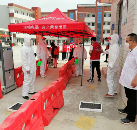 镇卫生院刘志明院长带领公共卫生科医护人员一行来到白鹤中学和石堰河中学,确保将安全隐患排除在学生入校前,上午守候在各自的岗位上。在校门口为学生消毒、进行体温监测后方可进入校园。