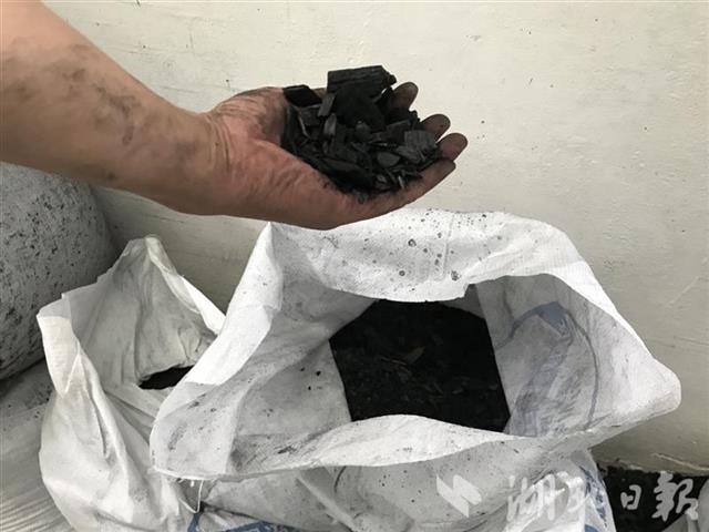 1个小时后,记者在一根蓝色管道的最末段看到,一块块黑色的炭从管口“出来”,落入下方的塑料袋里。