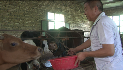 化龙堰镇上营村建档立卡户周邦林:“我拌这个酒渣的目的是叫牛把这个玉米秸秆的节节吃完,把这个料都搞干净,还有就是这个酒渣可以活它的血,可以健它的脾胃,叫它身上不长枯蜱黄。”