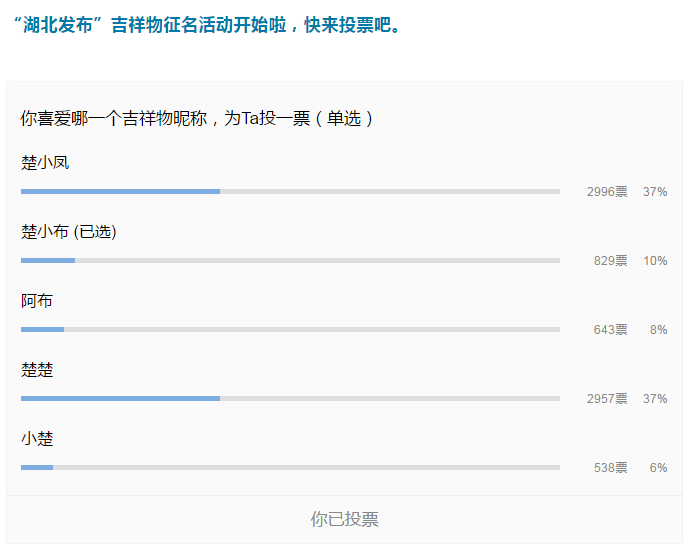 截至8月3日12时,已有超过10000名网友参与到“湖北发布”吉祥物征名活动。湖北日报、楚天都市报、荆楚网、湖北新闻、长江云、湖北经视、大楚网、长江网及全省各地发布系账号均相继转发相关报道,累计点击量超过10万次。