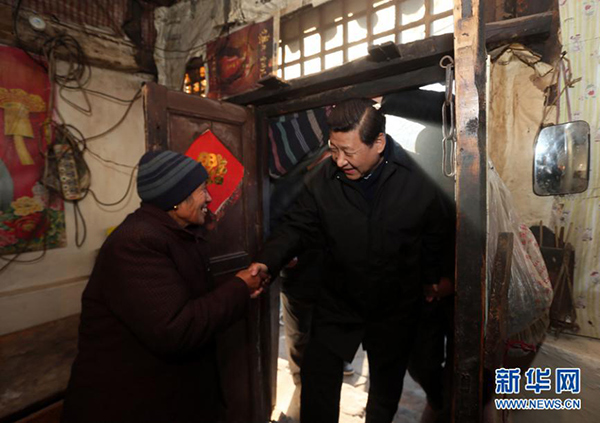 2012年12月29日至30日,习近平在河北省阜平县看望慰问困难群众。这是习近平在龙泉关镇骆驼湾村到困难群众唐荣斌家看望。新华社记者兰红光摄