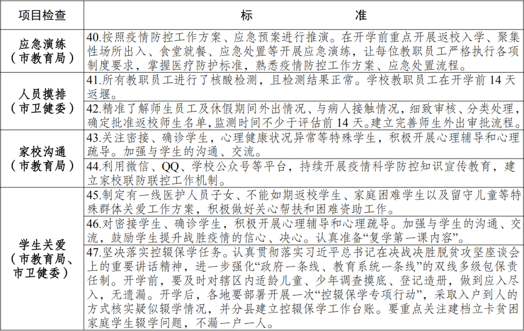 (一)严格要求。各地要严格按照中央和省、市有关要求认真开展评估验收,条件不达标,坚决不开学,切实保障师生生命安全和身体健康。各检查组要在各地疫情防控指挥部评估验收基础上,针对薄弱环节开展针对性抽查,切实为秋季开学学校(幼儿园)把好疫情防控和安全关。