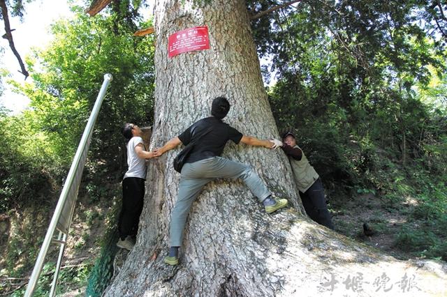 悬挂在树上的铭牌显示,这棵铁坚油杉树龄600年,也是该村3棵铁坚油杉中“年龄”最大的一棵。随后,记者一行又来到隔河相望的该村4组杉树寨,穿过田地、密林,看到另外两棵树龄500年的铁坚油杉,同样令人震撼。