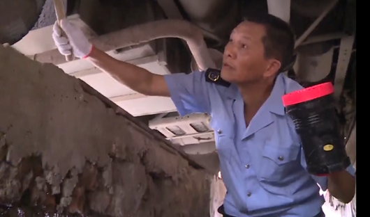 50多岁的陆忠天是房县客运站的一名老检车员,每天上午八点到十点,是他最繁忙的 时间,因为每一辆客运车辆只有经过他的“体检”,方可放行,虽然繁忙,但陆师傅 工作起来却一丝不苟,凭借着30多年的车检经验,任何安全隐患都逃不出他的火眼金睛。下午两点多,也是一个客车发班的高峰期,也正是一天中气温最高的时候,陆师傅一 方面要接受地沟高温的炙烤,还要接受客车发动机和排气管高温的烘烤,虽然人就像 放置在烤箱中,但检查转向、轮胎、刹车等各项工作,陆师傅一个环节也不减少,一 辆车检查下来,他已是满头大汗,如果遇到忙碌的时候,工作服全部汗湿。