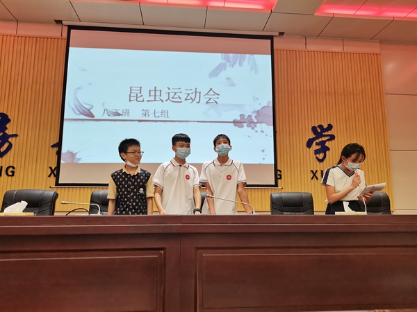 分享会以学生暑期共读书籍《昆虫记》为分享主题。来自八(3)班和八(9)班的10个读书分享团队依次走上主席台,从昆虫的种类、特征、习性、生存法则以及人生感悟等方面,畅谈了自己的读书心得体会。同学们还结合自己对昆虫外部形态和生物习性的理解,将昆虫幻化成蝴蝶公主、蜜蜂姑娘、娇弱赤条蜂、腹黑萤火虫等一个个生动的艺术形象。昆虫们办起了选美比赛,走进新闻直播间主播,举办起了运动会,组办起了擂台争霸赛。一个个想象力丰富、惟妙惟肖、精彩绝伦的表演,使整个分享会妙趣横生、遐思荡漾,为大家带来了一个个充满想象、别开生面的创意“昆虫秀”。