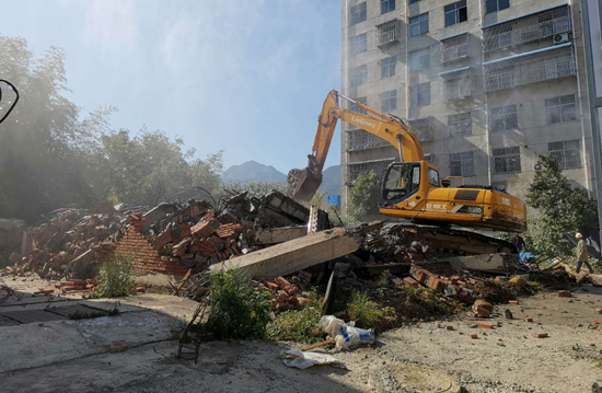 在拆除现场记者看到,违法建筑物整体框架已基本完成,但在挖掘机连续撞击房屋的轰鸣声中,钢筋混凝土结构墙面顺势倒下。同时为确保拆除行动顺利进行,相关部门执法人员现场拉起警戒线,对拆除现场进行安全隐患排查,并采取覆盖、洒水等降尘措施,确保拆除现场安全。