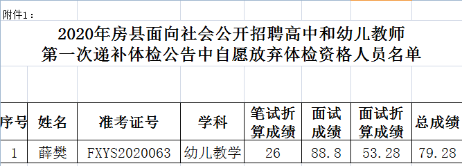 根据《2020年房县面向社会公开招聘高中教师公告》、《2020年房县面向社会公开招聘幼儿教师公告》,因第一次递补公告中个别考生自愿放弃体检资格,现将自愿放弃体检及进入递补体检人员名单、注意事项予以公告,请递补体检考生在规定时间和地点参加体检,逾期视为放弃。