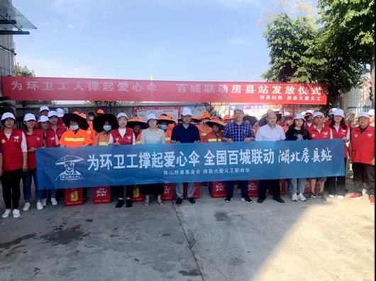 此次活动捐赠的500把爱心遮阳伞是房县妇联联合县大爱义工,通过浙江省妇女儿童基金会、浙江青山慈善基金会等在腾讯公益平台发起的“为环卫工人撑起爱心伞”募捐活动。爱心企业房县戴氏副食经营批发部为环卫工人捐赠凉茶。