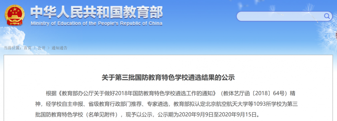 9月9日,教育部国防教育办公室公示第三批国防教育特色学校遴选结果,经学校自主申报、省级教育行政部门推荐、专家遴选,教育部拟认定1093所学校为第三批国防教育特色学校。其中,湖北有49所高校上榜。