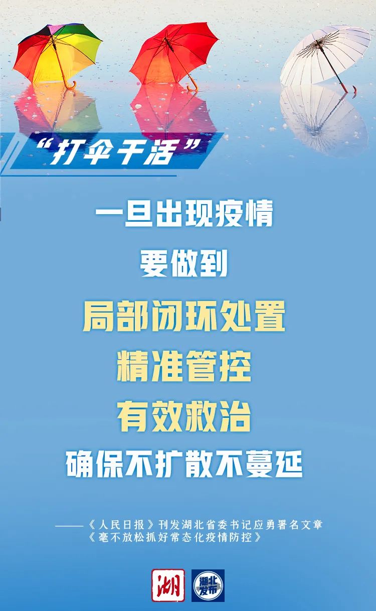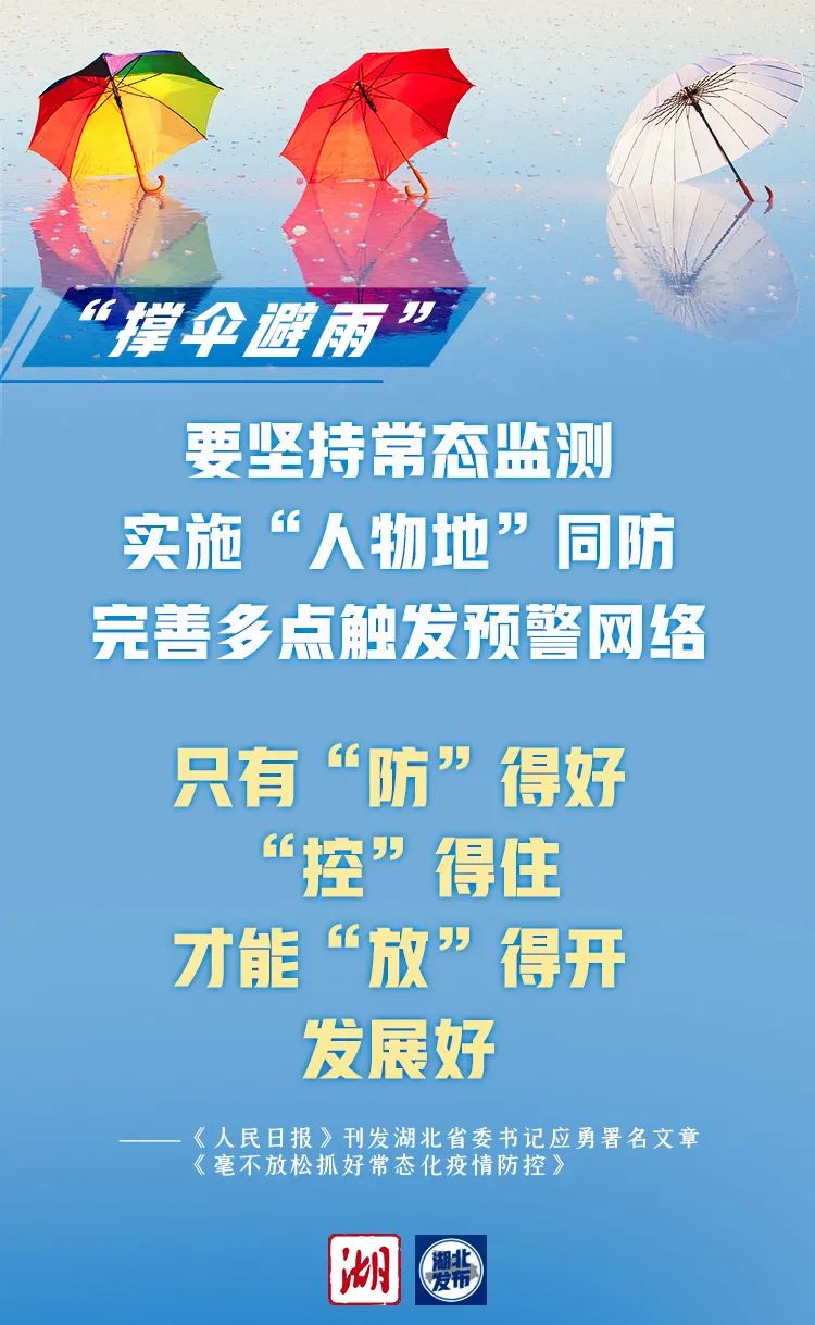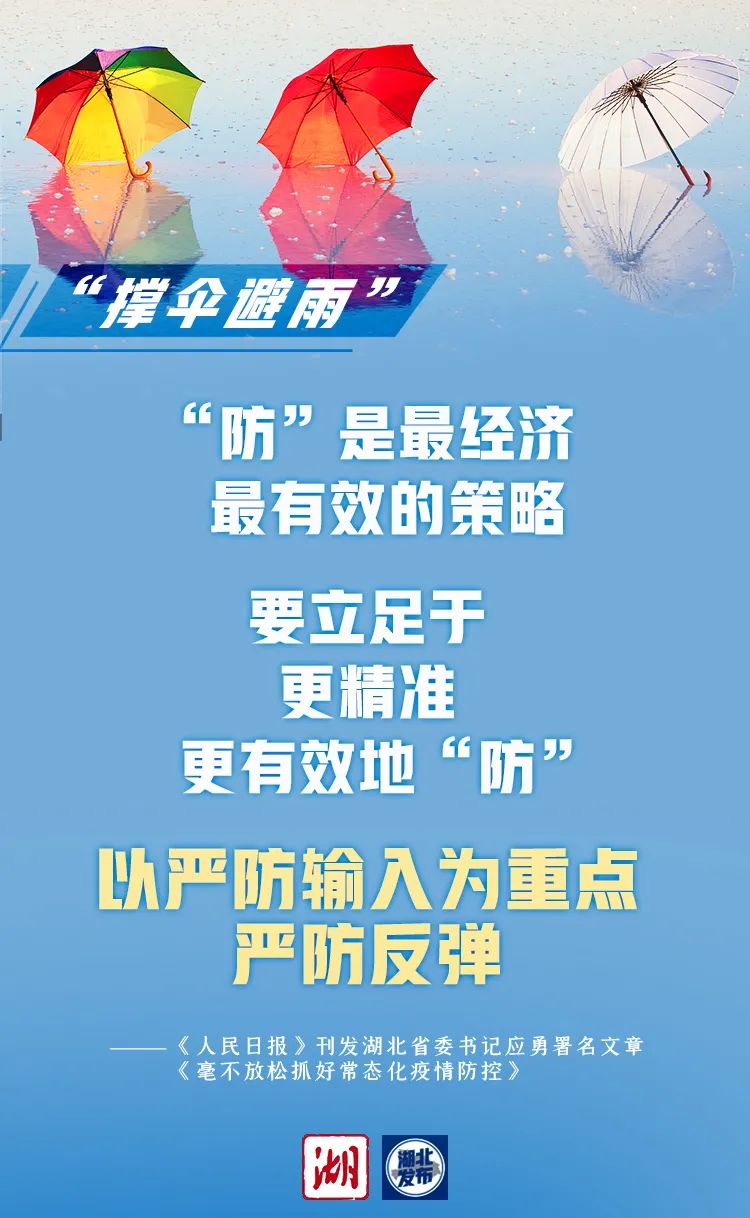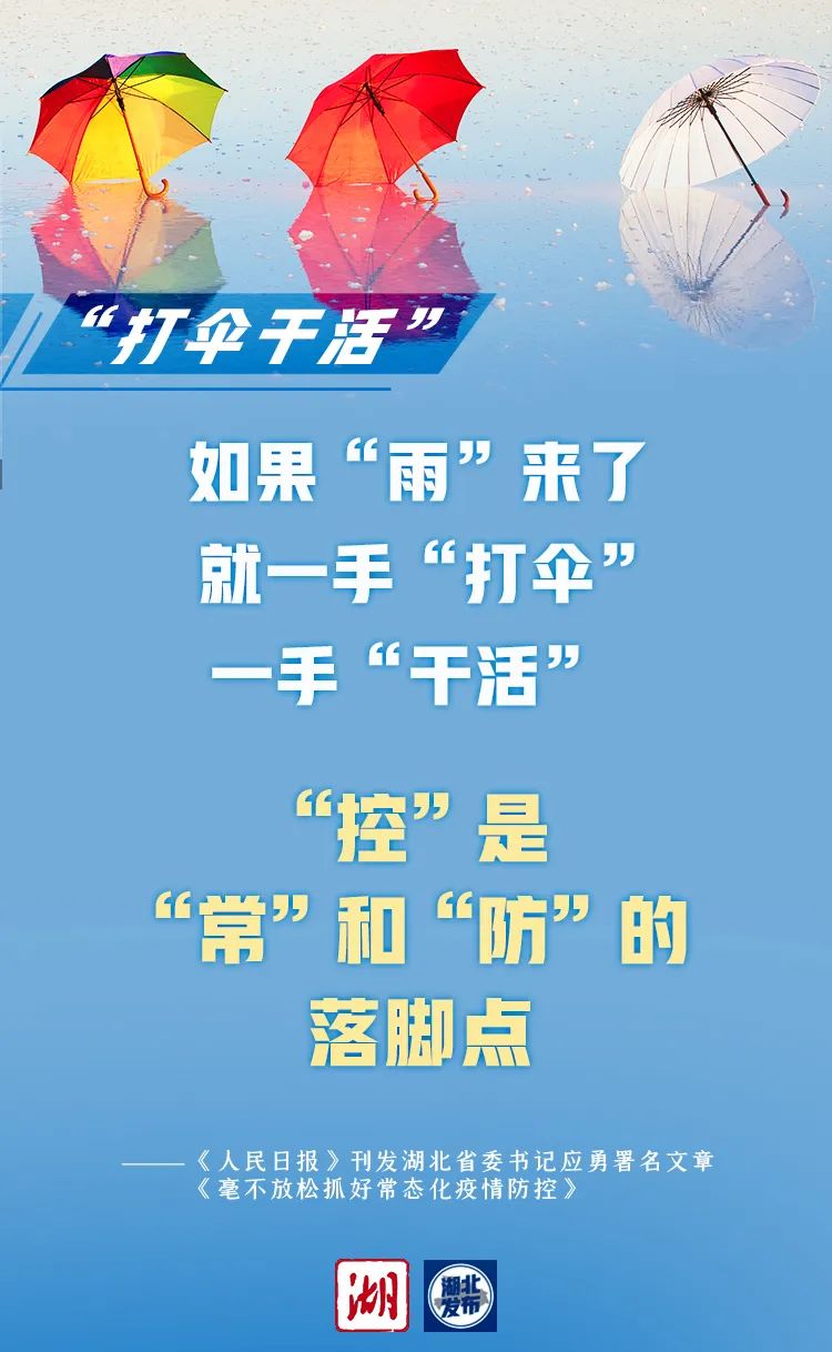 9月8日,习近平总书记在全国抗击新冠肺炎疫情表彰大会上发表重要讲话,强调要“毫不放松抓好常态化疫情防控,奋力夺取抗疫斗争全面胜利”,为我们指明了前进方向。湖北着力构建疫情防控和经济社会发展工作中长期协调机制,努力实现稳增长与防风险长期均衡,坚持常态化精准防控和局部应急处置相结合,做好较长时间常态化疫情防控的思想准备和工作准备,“晴天带伞”“撑伞避雨”“打伞干活”“修伞补强”,做到防控不松懈、疫情不反弹、发展不停步。