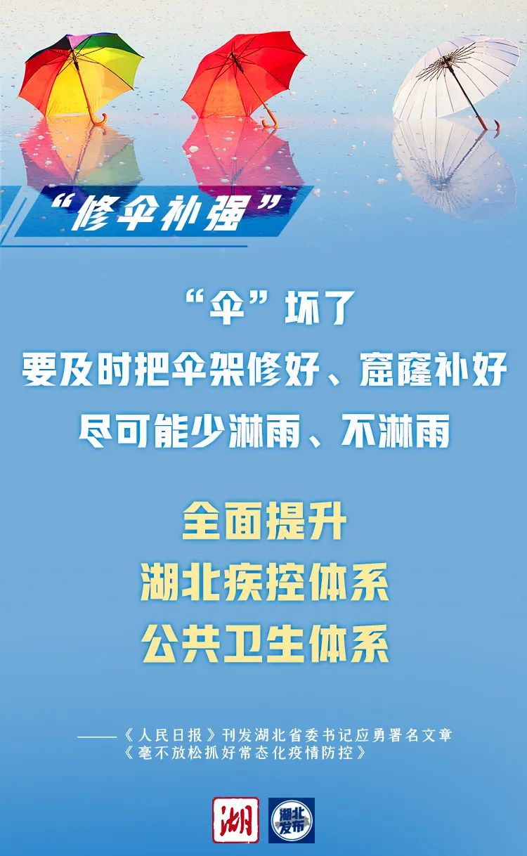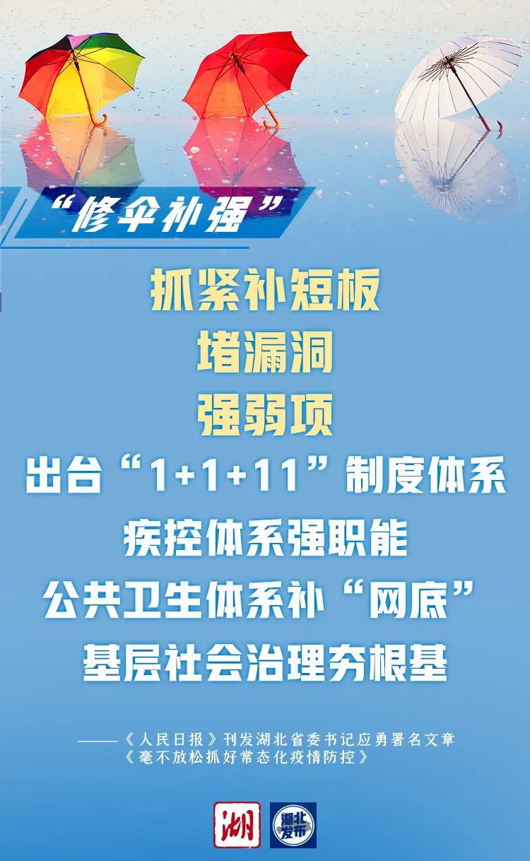 作为全国疫情最重、管控时间最长的省份,湖北经济社会发展遭受前所未有的严重冲击,给我们以切肤之痛。“伞”坏了就要及时把伞架修好、窟窿补好,尽可能少淋雨、不淋雨。湖北省委召开十一届七次全会,总结疫情防控实践中行之有效的做法,围绕暴露出的问题补短板、堵漏洞、强弱项,出台“1+1+11”制度体系,整体谋划、系统重塑、全面提升疾控体系和公共卫生体系,答好习近平总书记交给我们的“必答题”。
