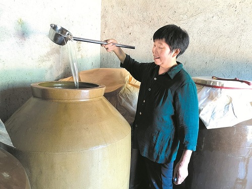 熊次连带记者参观了她的酿酒作坊,蒸馏、操作吊机、卸甑摊晾……每一步需要多少时间她都了然于心,操作起来也十分娴熟。在储藏室里,高高的酒坛子快要赶上她的身高。她搭着凳子从酒缸里为记者舀了一杯醇香的高粱酒,自豪地说:“我家的酒现在根本不愁销路,每年轻松售出三四千公斤。”她边说边拿出手机给记者看她微信上的订单,“回头客”源源不断。记者算了一下,她家的高粱酒卖60元一公斤,苞谷酒30元一公斤,仅此一项就是一笔可观的收入。