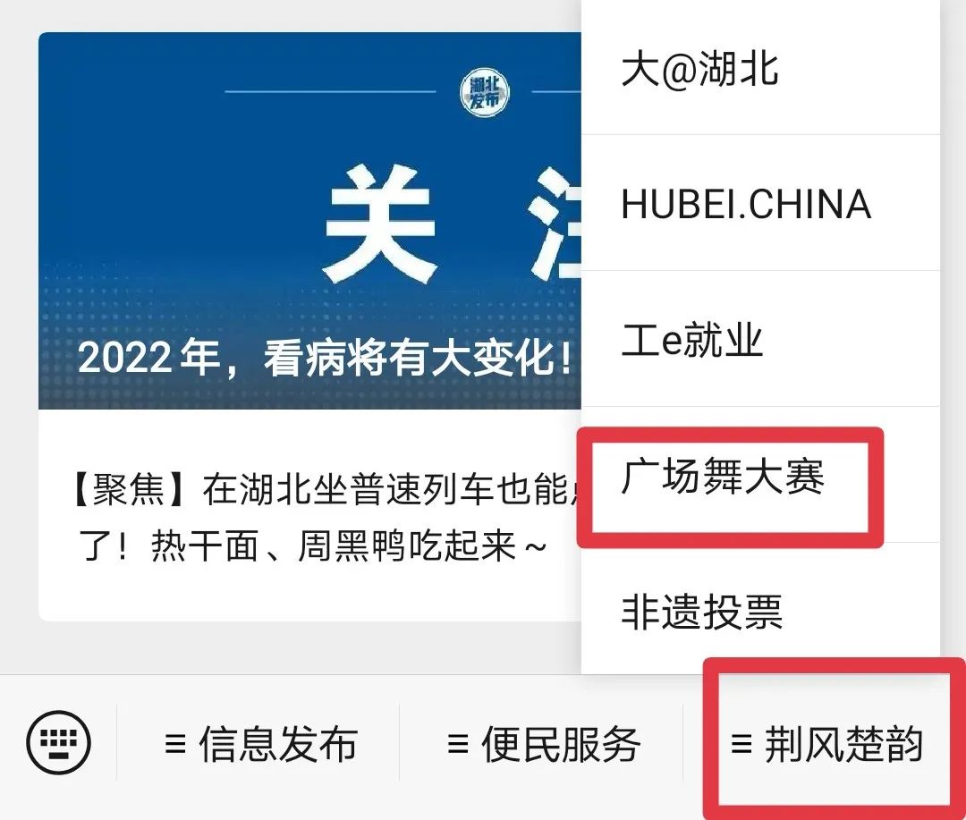 方法一:点击下方二维码关注“湖北发布”,点击菜单栏“荆风楚韵”-“广场舞大赛”进行投票。