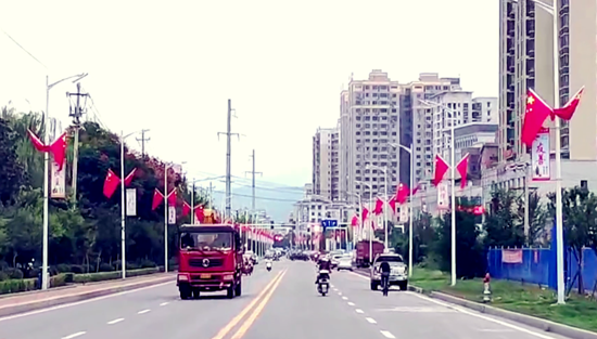 交通主干道上五星红旗、国庆标语随处可见