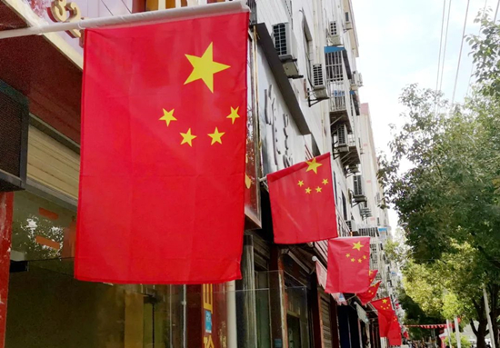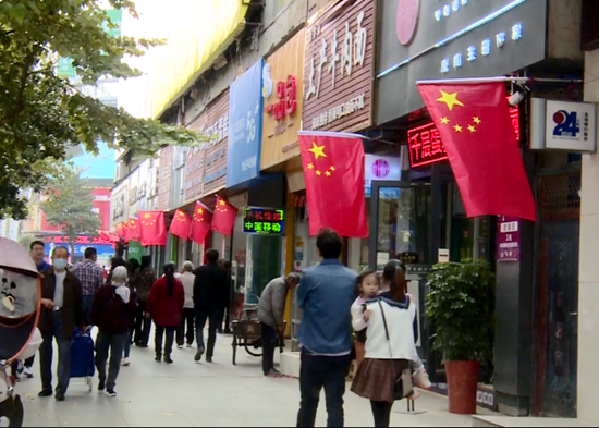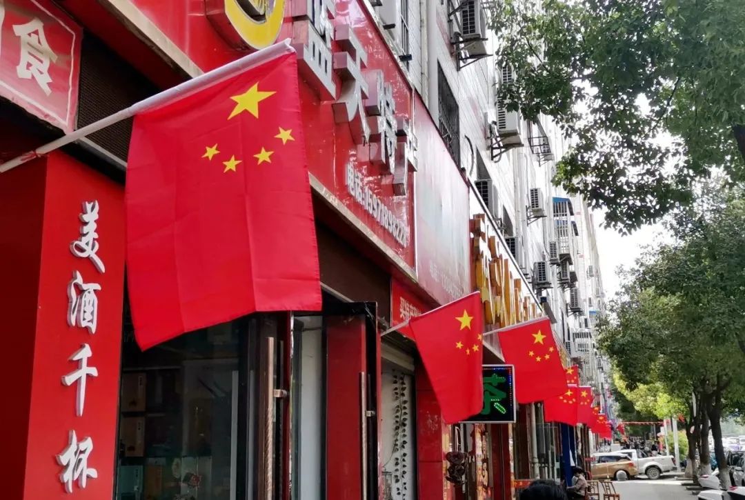 沿街商户自发悬挂鲜艳的五星红旗