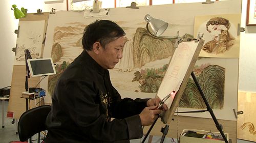 (今日房县网讯 记者代世旭报道) 今天是国庆佳节,也是中秋节。记者在房县西关街房陵烙画馆看到,房陵烙画非遗传人许光建正在精心制作烙画作品。这幅烙画作品以“贺中秋 迎国庆”为主题。随着烙铁的移动,北京天安门城楼等建筑跃然纸上。