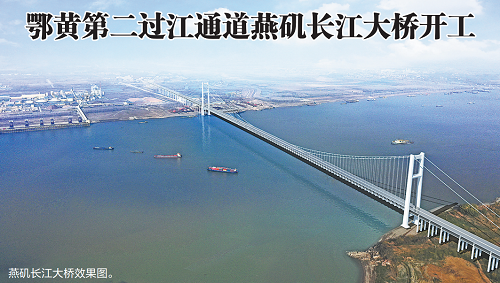 湖北日报讯 (记者柯利华、刘宇)10月18日,湖北国际物流核心枢纽项目(鄂州机场)的关键配套工程——燕矶长江大桥,在黄冈侧大桥锚碇施工区开工。项目建成后,从鄂州机场经大桥可直通武鄂、大广等高速公路,15分钟内通达黄冈市区。