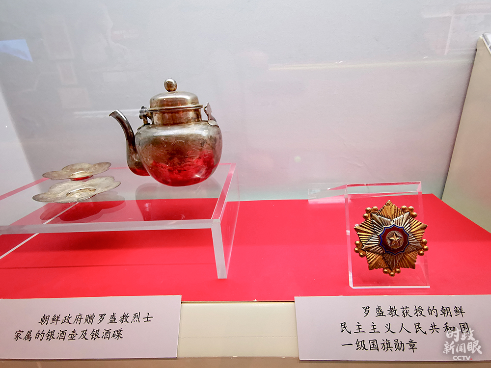 △左为朝鲜政府赠给罗盛教烈士家属的银酒壶、银酒碟,右为罗盛教获授的朝鲜民主主义人民共和国一级国旗勋章。(总台央视记者荆伟拍摄)