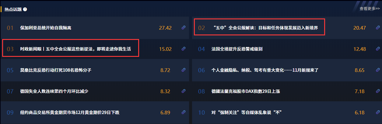 运用央视网“智闻”系统对30日全网新闻热点进行抓取,在热点话题一栏,全会公报相关报道稳居话题榜前列,相关报道也引起广大网友的热议。