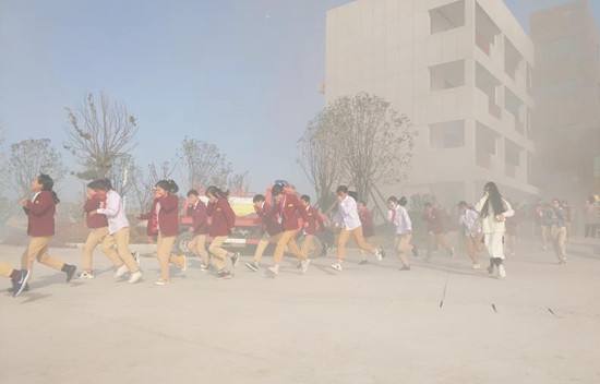 当天下午3点半,一阵刺耳的警报声响起,一楼大厅内浓烟滚滚,身穿校服的学生们用湿毛巾捂住口鼻,挨着墙,弯着腰在老师的带领下,快速有序的撤离到操场,消防人员迅速进入现场扑灭火源。演习结束后,消防官兵给在场师生现场讲解、示范有关消防器材的正确使用方法。