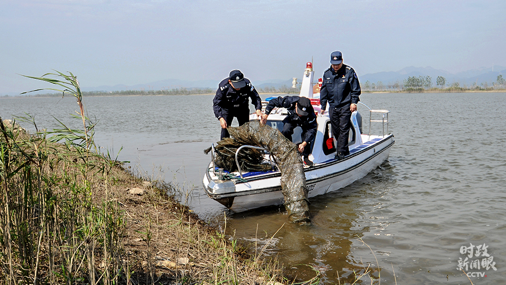 △安徽安庆渔政、公安执法人员在长江皖河段巡逻检查,查获捕捞工具。