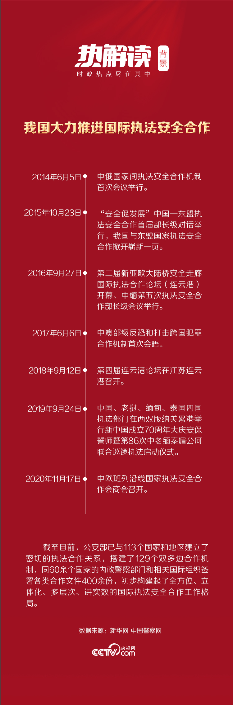 党的十八大特别是党的十九大以来,我国公安机关不断拓展国际执法合作的广度和深度。中俄国家间执法安全合作机制、中越打击犯罪合作部长级会晤、中缅执法安全合作部长级会晤、中马公安内政部门联合工作组会议、中印公安内政高级别安全与反恐会晤、中德公安内政部门副部级年度会晤……国际执法安全合作结出累累硕果。