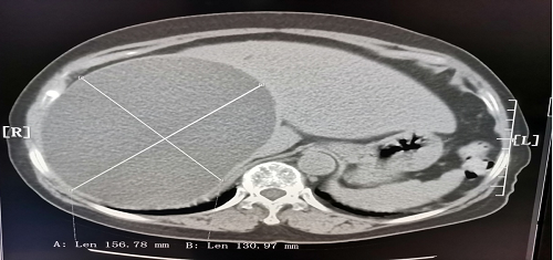 今日房县网讯 11月28日上午,房县人民医院急诊科主任雷禹接诊的一位80岁高龄女性患者,其CT图像显示肝脏上长一14cmx15cm巨大囊肿. 且紧贴肝脏表面,有随时破裂,引起大出血的风险,紧张的术前检查中发现患者患有高血压、血尿(+++)、白细胞增高等异常情况,需要进一步治疗才具备手术条件,但不及时手术,又存在囊肿随时破裂危及患者生命的巨大风险。