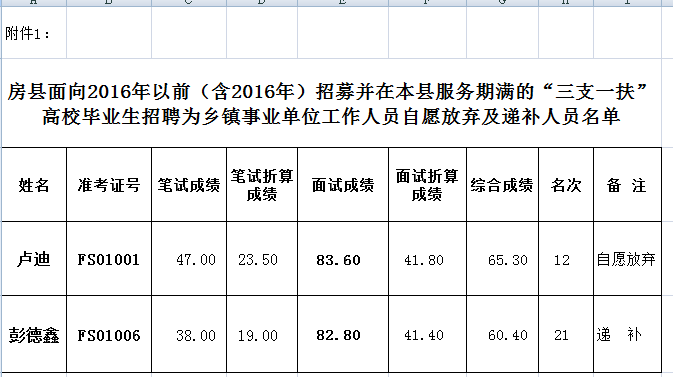 附件1:房县面向2016年以前(含2016年)招募并在本县服务期满的“三支一扶”高校毕业生招聘为乡镇事业单位工作人员自愿放弃及递补人员名单