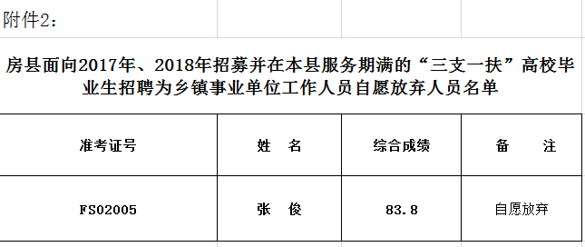 附件2:房县面向2017年、2018年招募并在本县服务期满的“三支一扶”高校毕业生招聘为乡镇事业单位工作人员自愿放弃人员名单