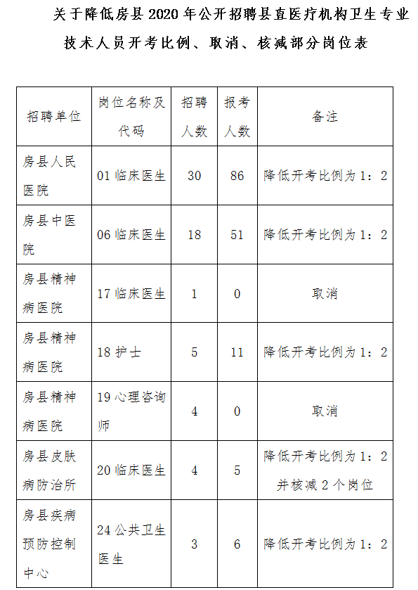 附:关于降低房县2020年公开招聘县直医疗机构卫生专业技术人员开考比例、取消、核减部分岗位表