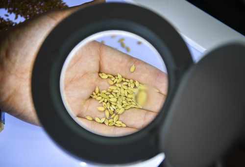 在吉林省吉林市永吉县一拉溪镇九月丰家庭农场,工作人员在实验室中检测一批试种水稻的稻谷外观(8月12日摄)。新华社记者 许畅 摄