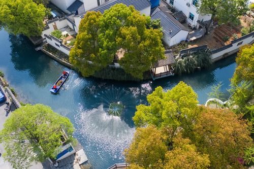 浙江省长兴县龙山街道渚山村,保洁人员进行日常河道护理巡查(4月9日摄,无人机照片)。新华社记者 徐昱 摄