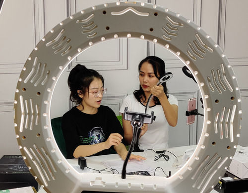 8月25日,广西外国语学院越南留学生邓氏仙(右)在广西自贸试验区南宁片区一家跨境电商企业直播人才孵化基地内进行直播。中国(广西)自由贸易试验区设立以来,紧紧围绕建设引领中国—东盟开放合作高标准高质量园区的发展目标,深耕“试验田”,有效激发市场活力、促进产业落地生根,为广西经济高质量发展和扩大开放注入了新动能。新华社记者 雷嘉兴 摄