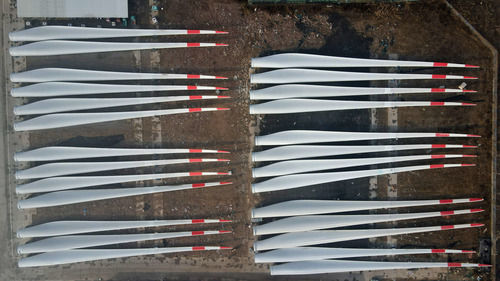 这是河北省威县一家风电设施生产企业内的大型风电机组叶片(12月8日摄,无人机照片)。新华社记者 牟宇 摄