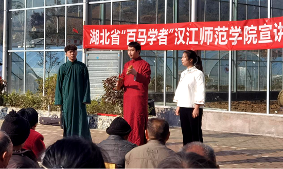 图为汉江师范马克思主义学院学生在为群众表演快板