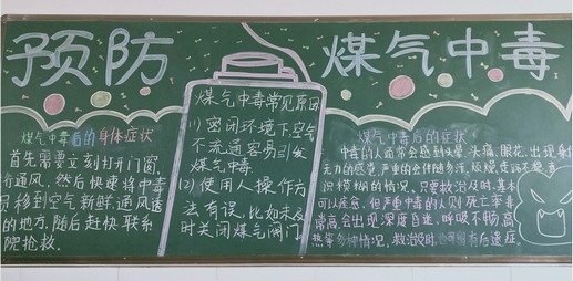 开展主题黑板报评比活动。同学们收集了防一氧化碳中毒方面的资料,自主设计版面和文字,在制作黑板报的过程中了解更多的安全常识,加深了对安全的认识。