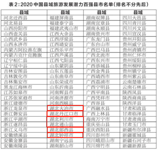 湖北六地入选“2020中国县域旅游发展潜力百强县市”