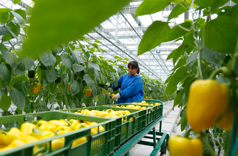 △2020年12月11日,在河北省邢台市南和区贾宋镇,农民在采摘彩椒。