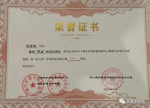 眼科护士长许世玲为解决这一矛盾,根据双眼距离,改良洞巾尺寸,制作成“带盖”的双孔洞巾,即保证了手术区域,又减少了暴露污染机会;即满足了手术医生需要,又改善了患者手术体验。制作简单易行,成本低廉,适用于所有单眼手术,双眼手术需求。(特别是双眼眼部美容手术),此项目填补了“带盖”的双孔洞巾空白,荣获十堰市第一届“驼人杯”护理用品创新大赛一等奖!