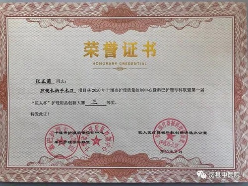 房县中医院自制长刀柄手术后,已经使用临床6年,完成了输尿管切开取石30余例。此次腔镜长柄手术刀在十堰市第一届“驼人杯”护理用品创新大赛中喜获三等奖!