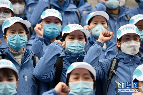 2020年2月9日,在山东济南,山东大学第二医院支援湖北抗疫国家医疗队中的党员在出发前重温入党誓词。新华社记者 朱峥 摄
