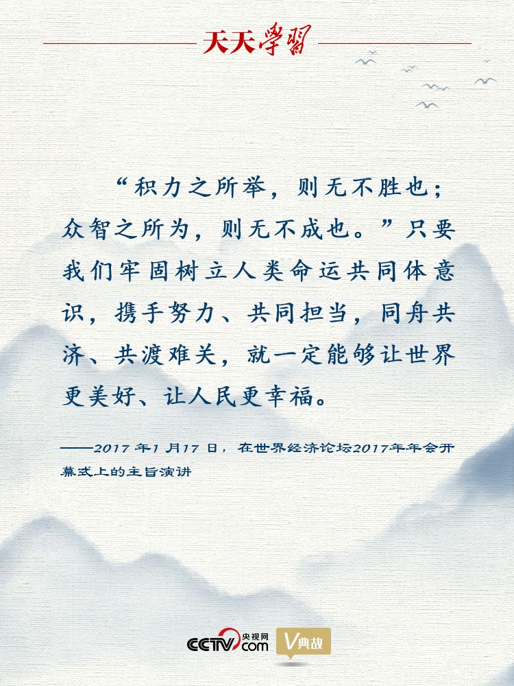 天天学习2017年1月17日,世界经济论坛2017年年会在瑞士达沃斯开幕。国家主席习近平出席开幕式并发表题为《共担时代责任 共促全球发展》的主旨演讲,强调要坚定不移推进经济全球化,牢固树立人类命运共同体意识,共同担当,同舟共济,共促全球发展。第二天,在联合国日内瓦总部,习近平主席又发表题为《共同构建人类命运共同体》的主旨演讲,深刻、全面、系统阐述人类命运共同体理念。4年来,人类命运共同体理念及其深刻的实践意义从达沃斯传出,在世界范围内回响。这是藉由中国智慧提出的中国主张、发出的中国声音,展现了我国在复杂多变的国际形势下积极参与全球治理的大国担当。