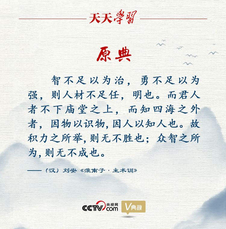 事实上,早于《淮南子》300多年的《文子》也有类似表述:“夫人君者,不出户以知天下者,因物以识物,因人以知人。故积力之所举,即无不胜也;众智之所为,即无不成也。”