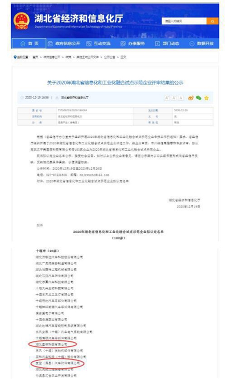 今日房县网讯 通讯员 昝鹏飞 报道:近日,2020年湖北省“两化融合试点示范企业”和“专精特新‘小巨人’企业”名单公布,房县4家企业榜上有名。其中湖北天龙石墨有限公司和湖北武当动物药业有限责任公司入选湖北省专精特新“小巨人”企业;湖北壹徕科技有限公司和麦登(房县)汽车附件有限公司入选湖北省信息化和工业化融合试点示范企业,截至目前,全县两化融合类试点示范企业达到12家,数量位居全市前列。