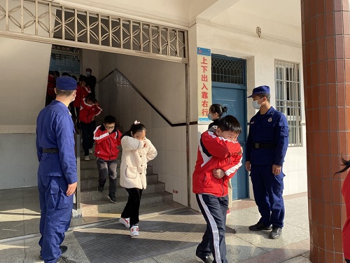 演练假设学校教学楼发生火灾,警报响起后,同生们在老师的指导下,用湿毛巾、衣袖等捂住口鼻,弯腰沿着墙角、楼梯紧张有序地逃离“火场”,整个过程井然有序,全体师生安全疏散到指定地带,演练取得了圆满成功。