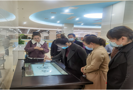 游客在图书馆进行书法体验